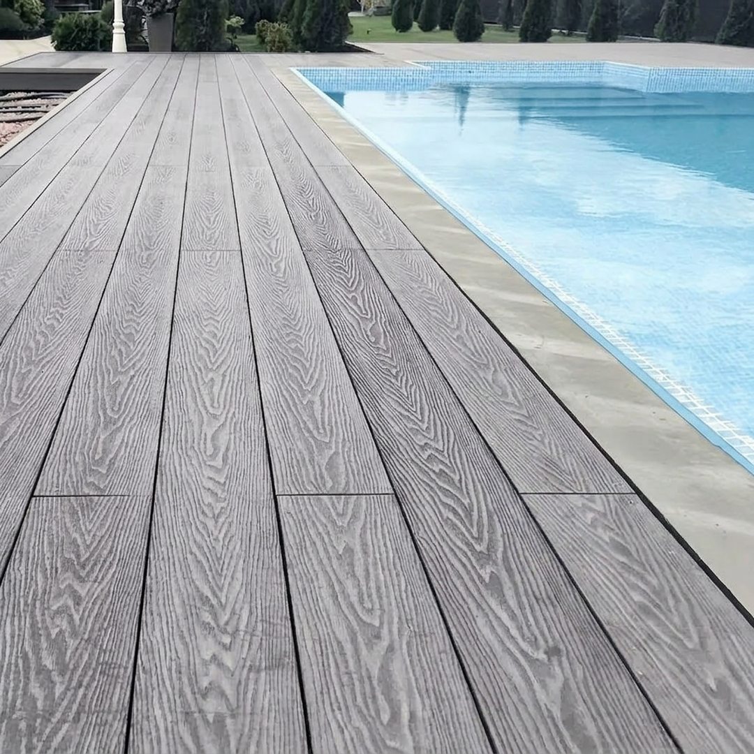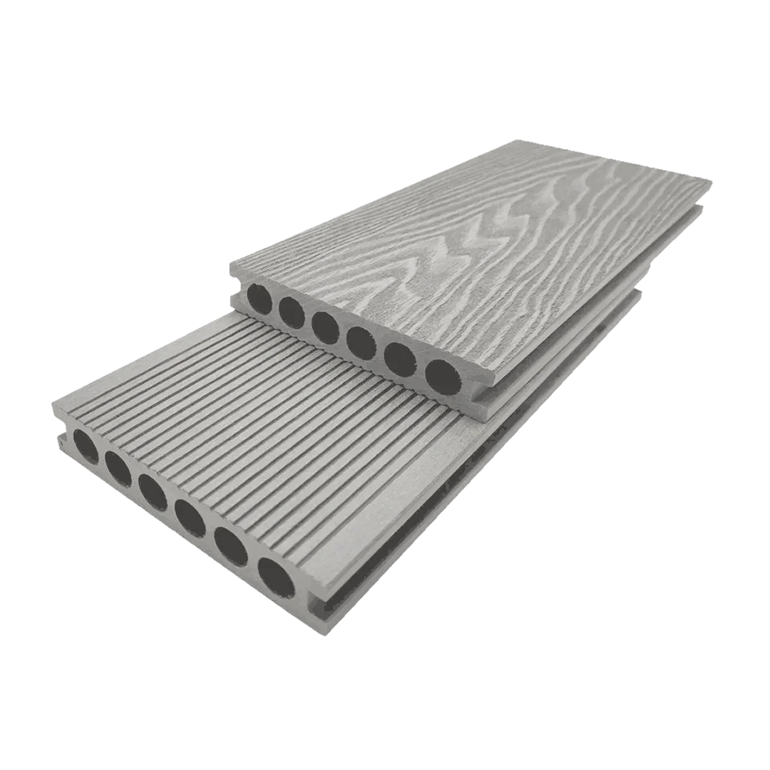 Tabla de deck WPC en color light gray, con terminación ranurada antideslizante y textura de madera 3D. Diseñada para exteriores que buscan durabilidad, estética y mínimo mantenimiento. Ideal para lograr espacios contemporáneos sin las complicaciones de la madera tradicional.