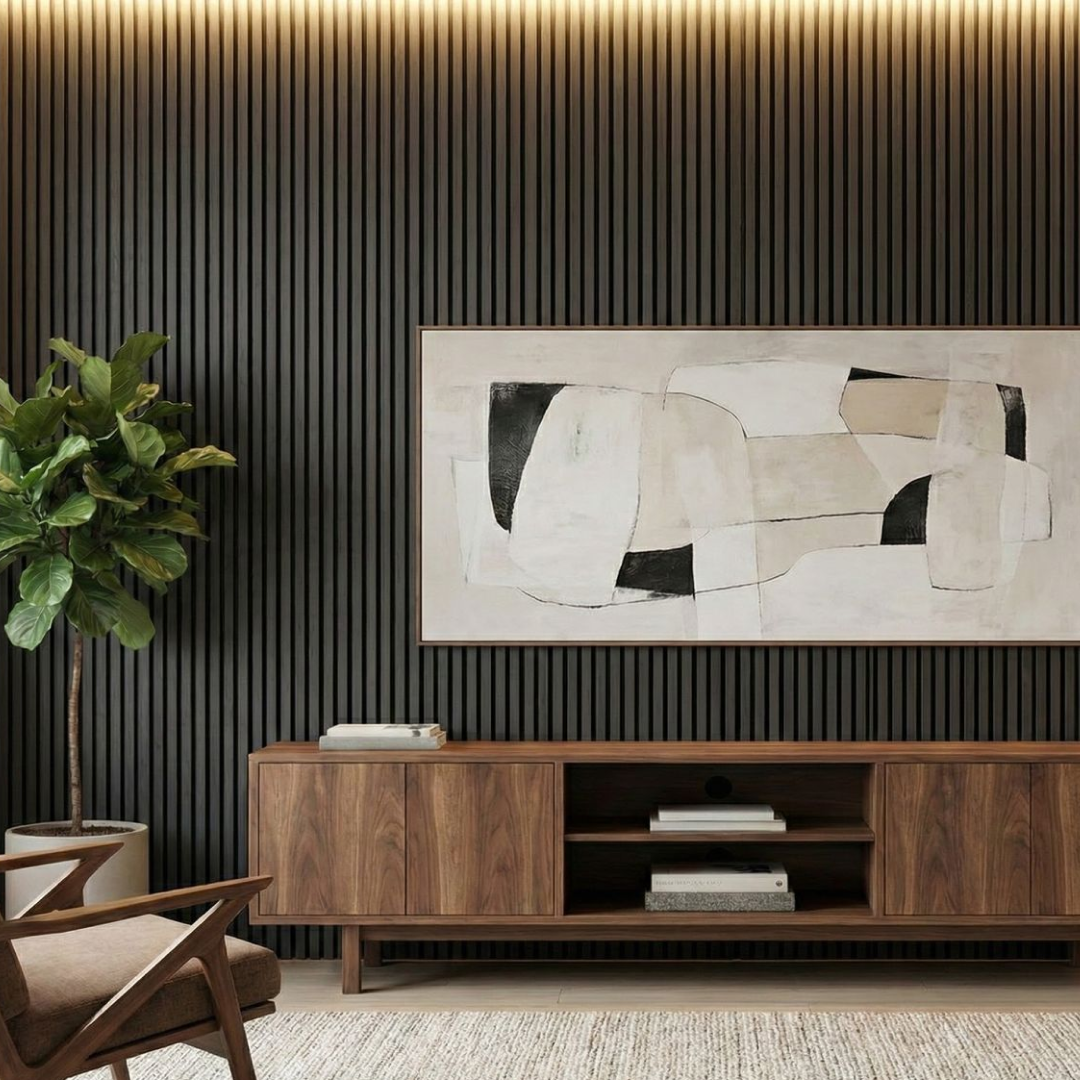 Panel decorativo interior en WPC en color black, ideal para aportar calidez, textura y diseño a espacios modernos sin necesidad de mantenimiento.